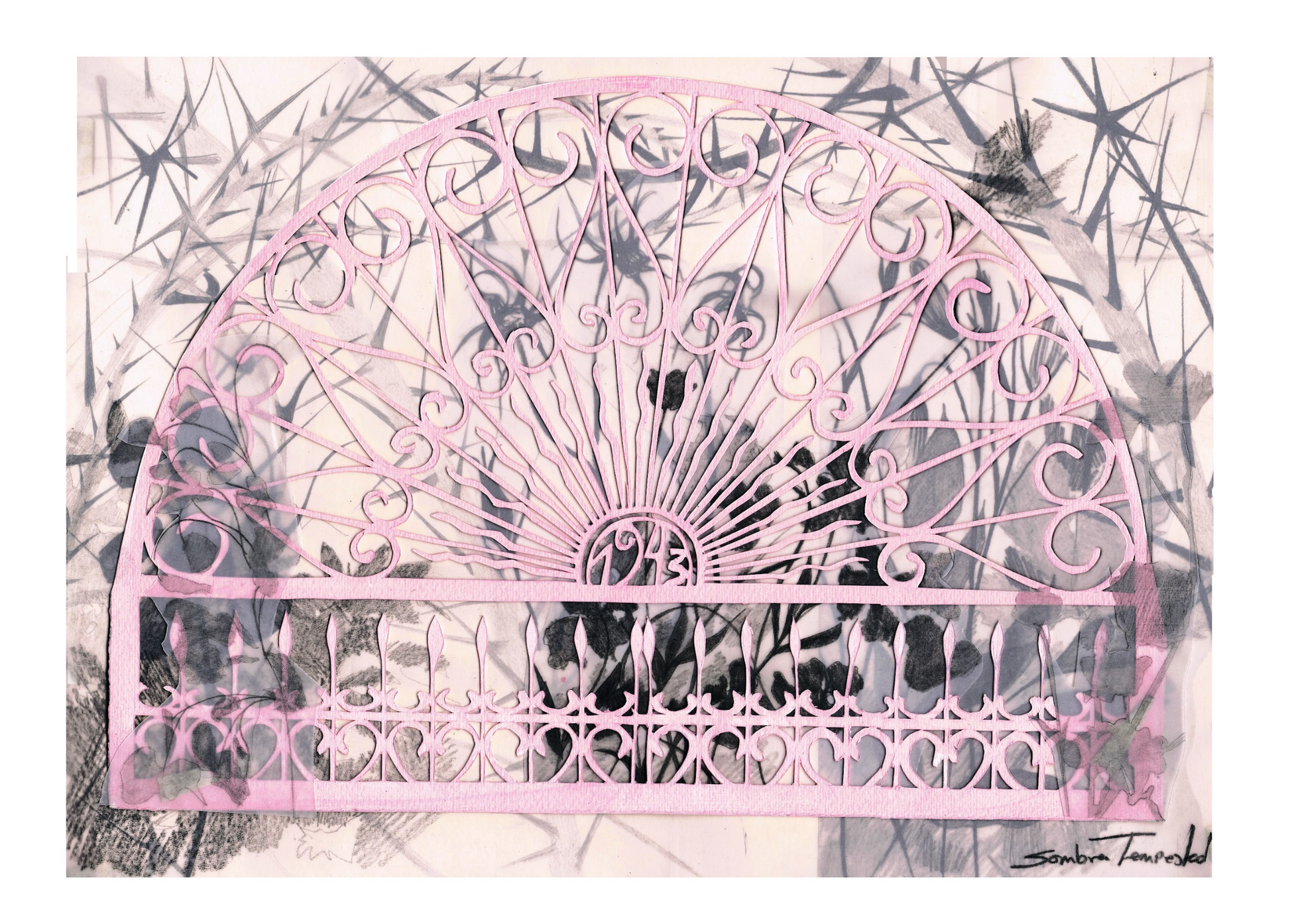 Collage de papel calado, grafito, acrílico y albanene sobre papel de algodón 250g.